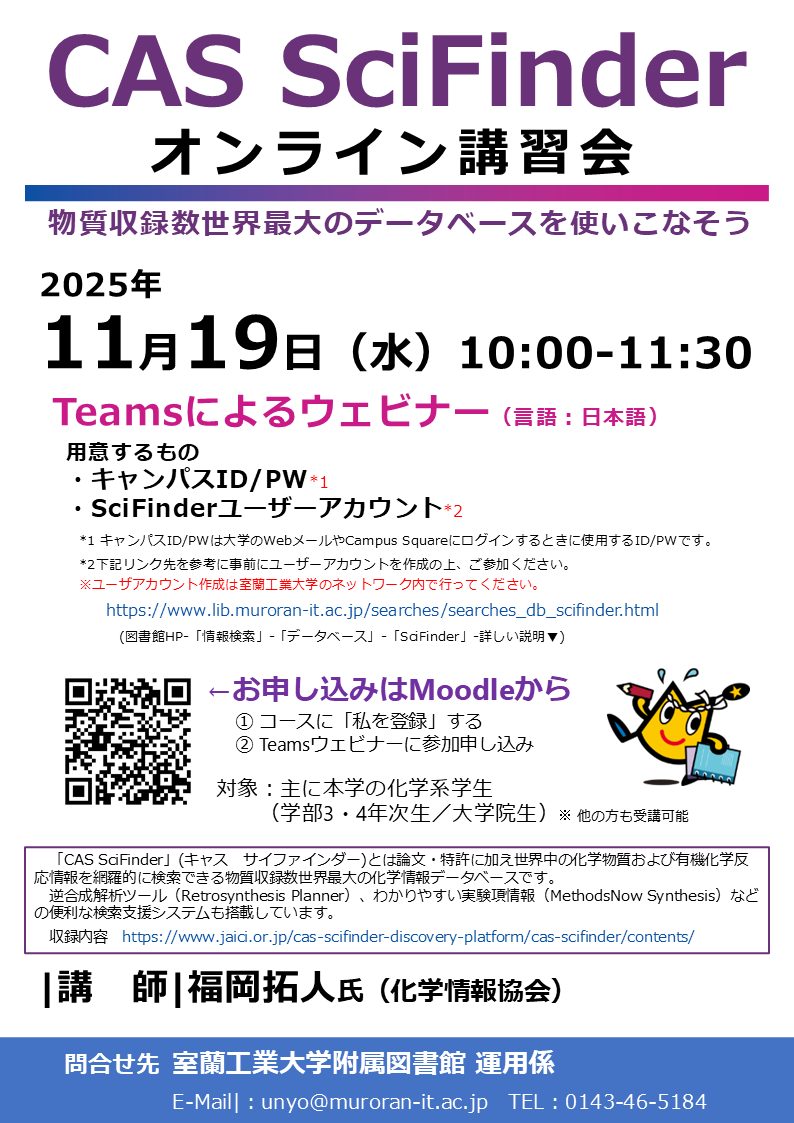 主な対象: 本学の化学系学生(主に学部3・4年次生/大学院生) ※他の方も受講可能 内 容: ・CAS SciFinderの概要 ・CAS SciFinderの使用方法 日 時:令和7年11月19日(水) 10:30-11:30 開催方法:Teamsウェビナー 講 師:福岡 拓人 氏(一般社団法人化学情報協会) 申込方法:Moodleから「SciFinder講習会」にコース登録し、Teamsウェビナーに参加申し込みしてください。 コース: SciFinder講習会 | Moodle2023 問合せ先:総務広報課図書学術情報室運用係 0143-46-5184 |